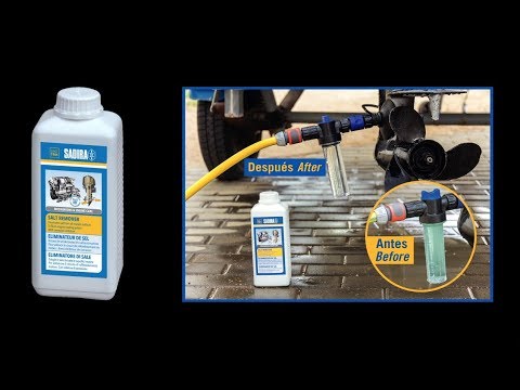 In marine engines, a solution of 200 to 500 ml of the salt scavenger in 10 liters of water is passed through the cooling circuit for 5 to 15 minutes. It can be done through the immersion of the glue in a container or through a dispenser that is sandwiched between a hose with ear muffs.